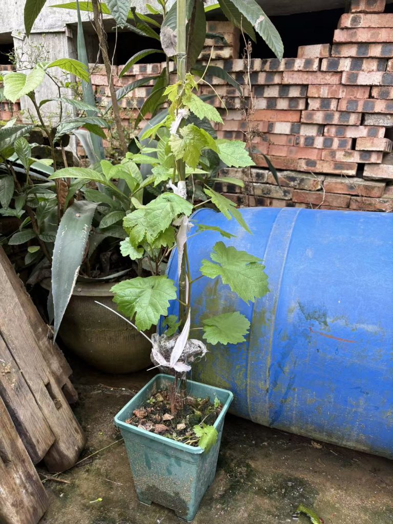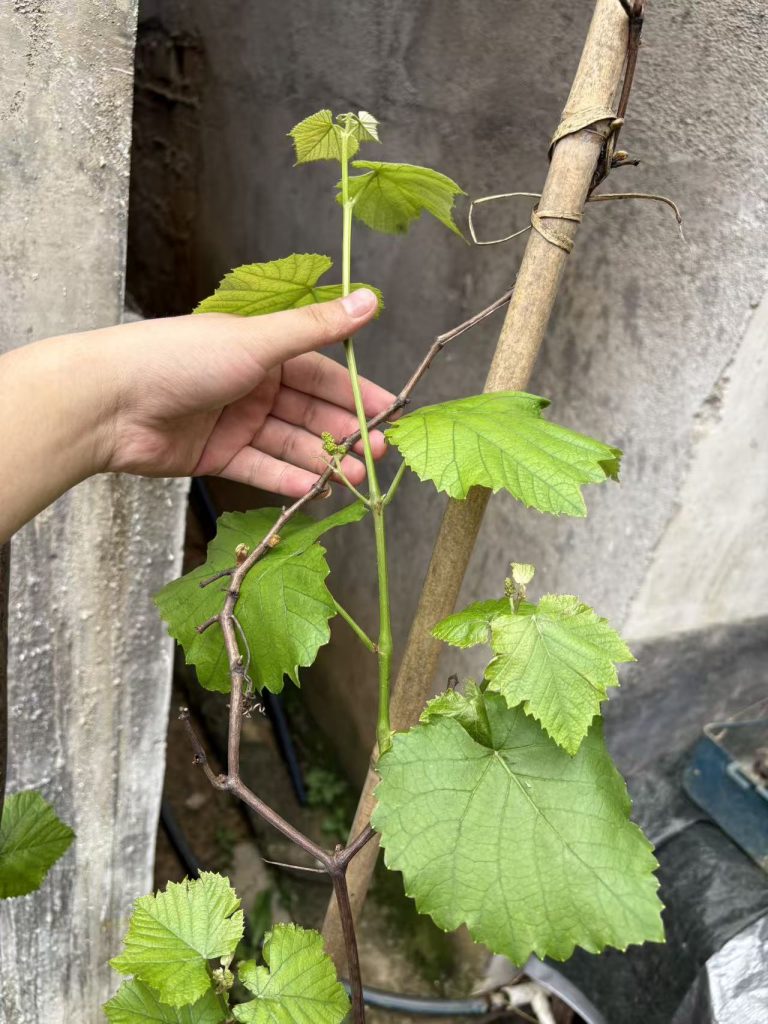 2025 年清明,正是万物生长的黄金时节,我收到了这棵寒香蜜葡萄苗。彼时的它,带着几根纤细的枝条,几片嫩绿的叶片,透着几分稚嫩。我给它选了透气的方形花盆,用腐叶土 + 园土 + 腐熟有机肥调配了营养土,栽下后浇透定根水,用一根竹子做支撑,盼着它能像无花果、樱桃一样,快速爆长、当年丰产。