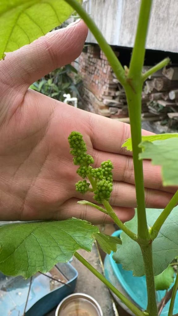 好在寒香蜜的丰产性确实名不虚传,即便树势偏弱,到了 2025 年花期,枝头还是抽出了足足 5 串饱满的葡萄花穗。看着这一串串嫩绿的花穗,我既惊喜又忐忑:惊喜于弱苗也能开花,忐忑于树势不足,能不能顺利坐果、成熟。最终,这几串花穗顺利坐果,虽然果实个头不大、产量不高,但也让我尝到了自己种的寒香蜜,那股浓郁的蜂蜜甜香,足以抵消所有遗憾。