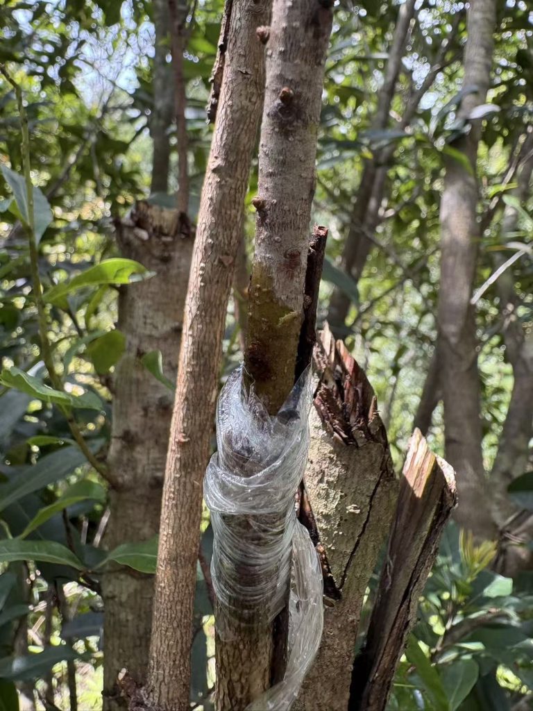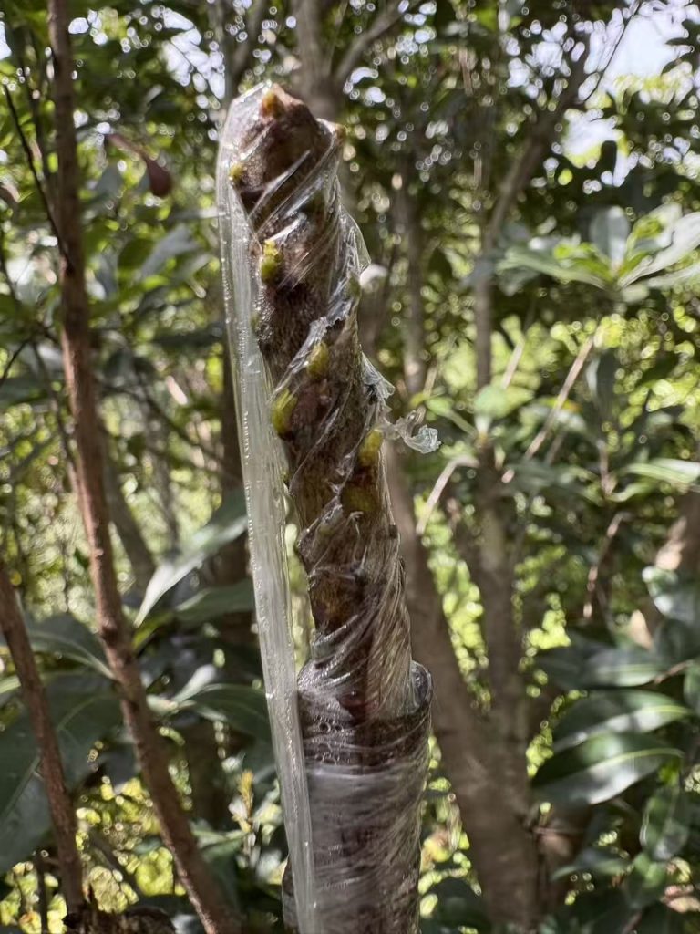 从图片里能清晰看到:接穗上的芽点饱满,颜色鲜绿,嫁接口包裹的保鲜膜完好,接穗没有任何发黑、腐烂的迹象。这种状态,是杨梅嫁接中最常见的 “悬而未决”: