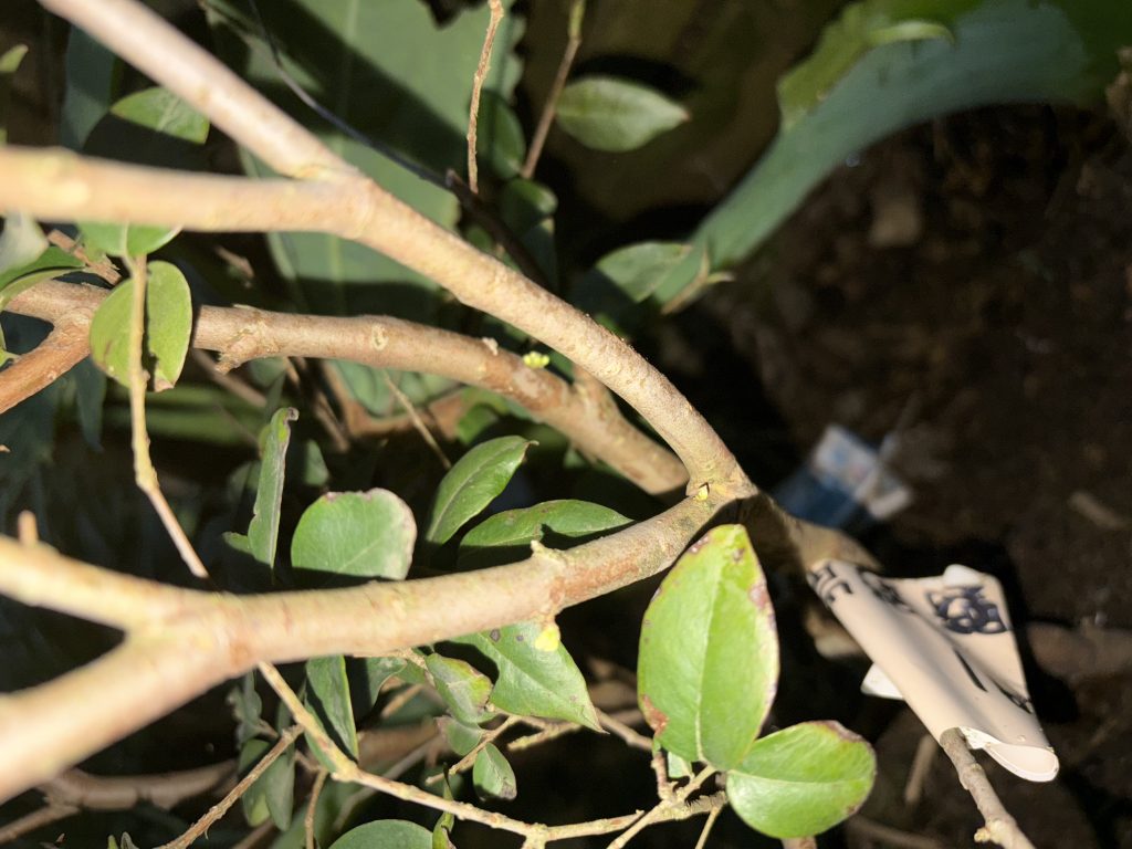 虽然它的整体长势依旧不算粗壮,枝条还是偏细,但和我想象中“僵苗枯萎”的样子完全不同: 树苗的顶部,抽出了密密麻麻的鲜嫩新叶,新叶带着淡淡的红褐色,边缘光滑,层层叠叠地舒展着,透着满满的生命力;更让我惊喜的是,在它纤细的树干和主枝上,竟然冒出了五六朵饱满的花苞!这些花苞呈嫩绿色,小小的、圆圆的,紧紧贴在树干上,这正是沙巴嘉宝果最标志性的“树干开花”特征,安静又可爱,不仔细看根本发现不了。