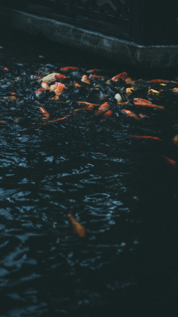池中的锦鲤攒动,橙红的身影在墨色的水面翻涌,搅碎了树影与天光。