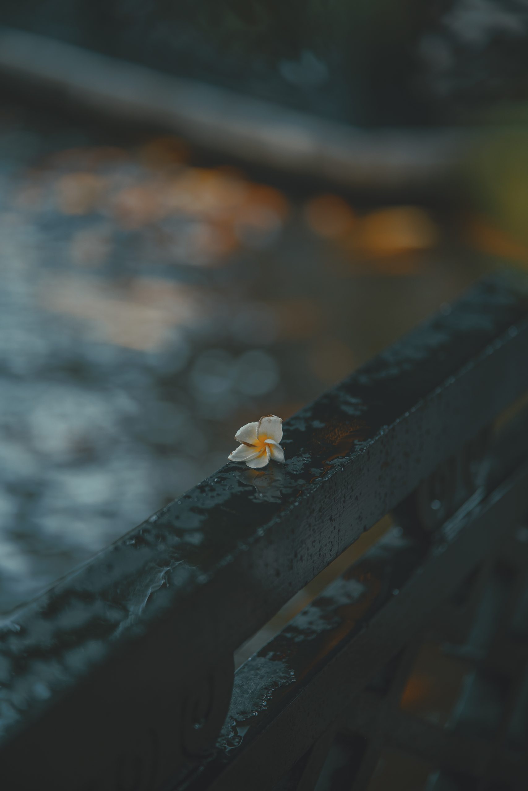 雨刚停过,栏杆上还凝着水珠,一朵鸡蛋花落在上面,白瓣黄蕊,在暗调的背景里格外醒目。