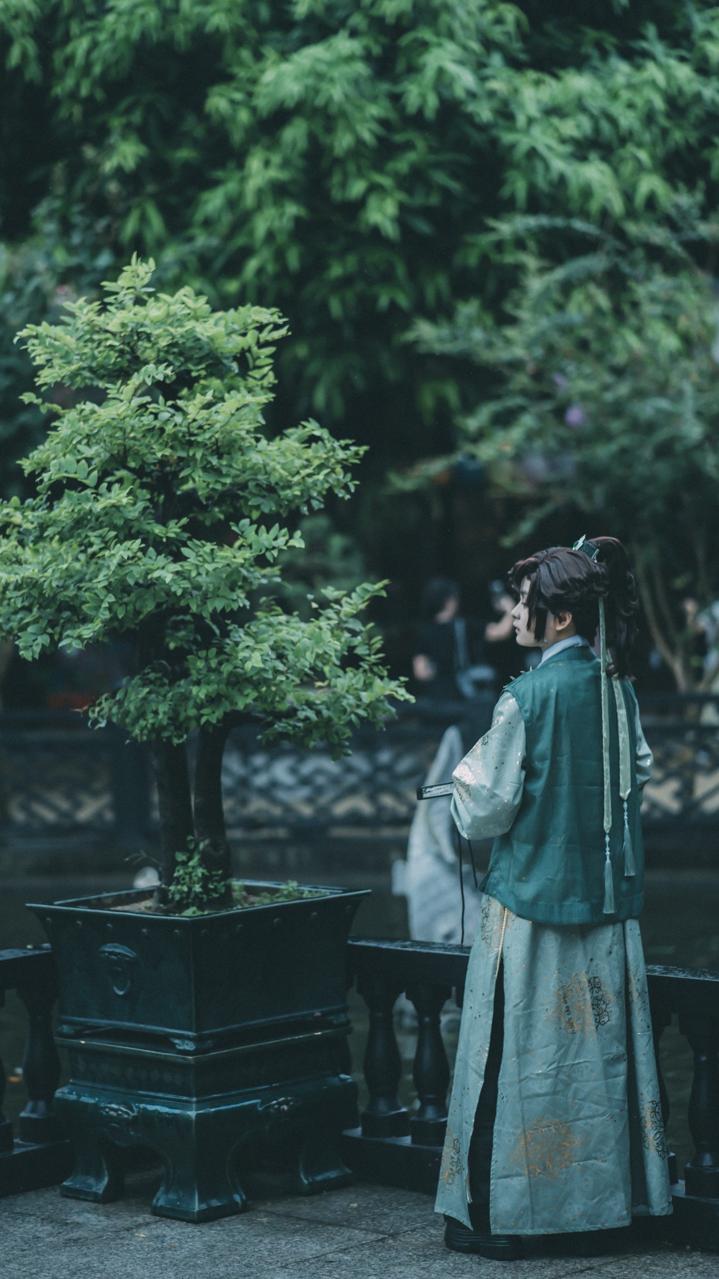 穿青绿色汉服的书生倚着