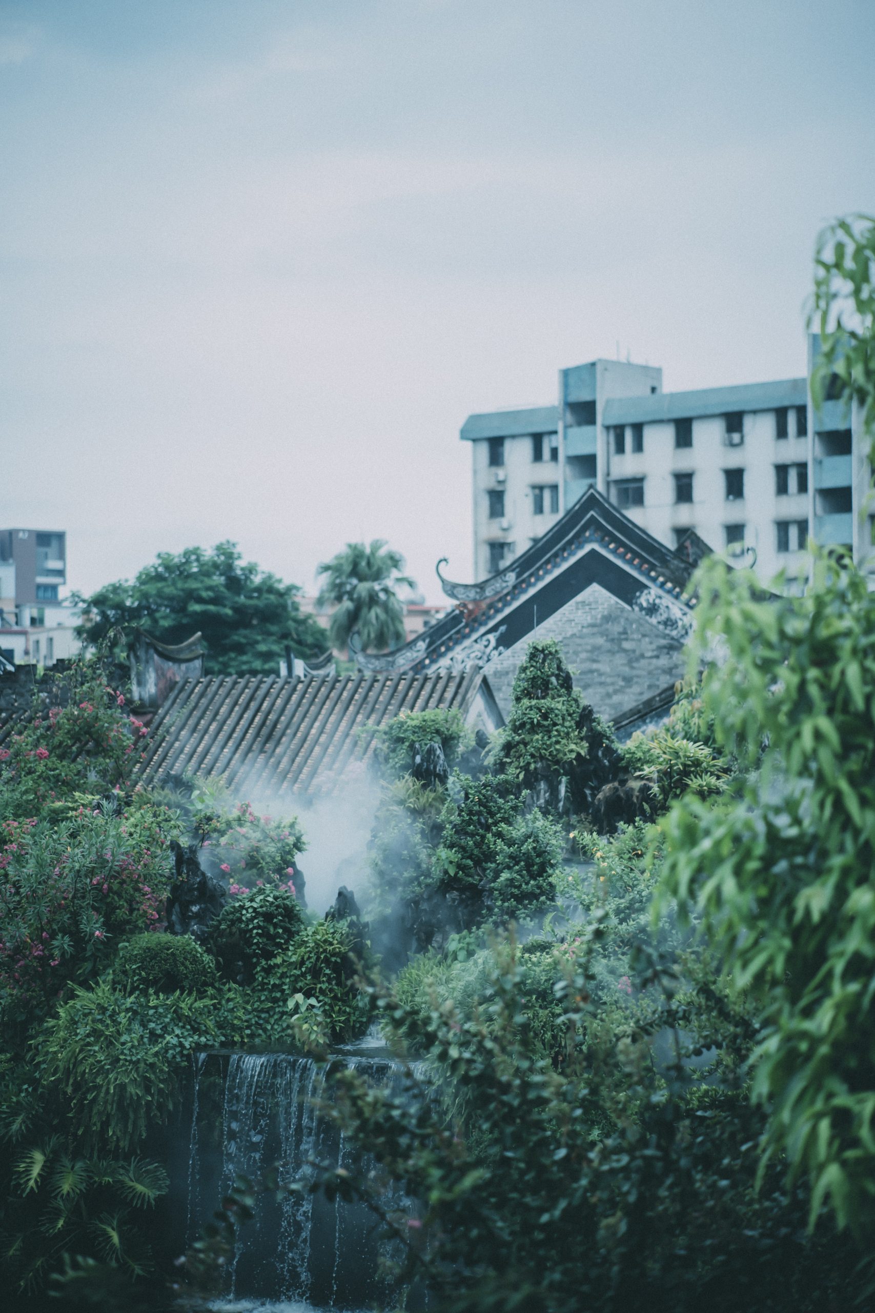 青瓦飞檐在水汽里晕开轮廓,假山叠石间的流水声,混着草木的湿气漫过来。